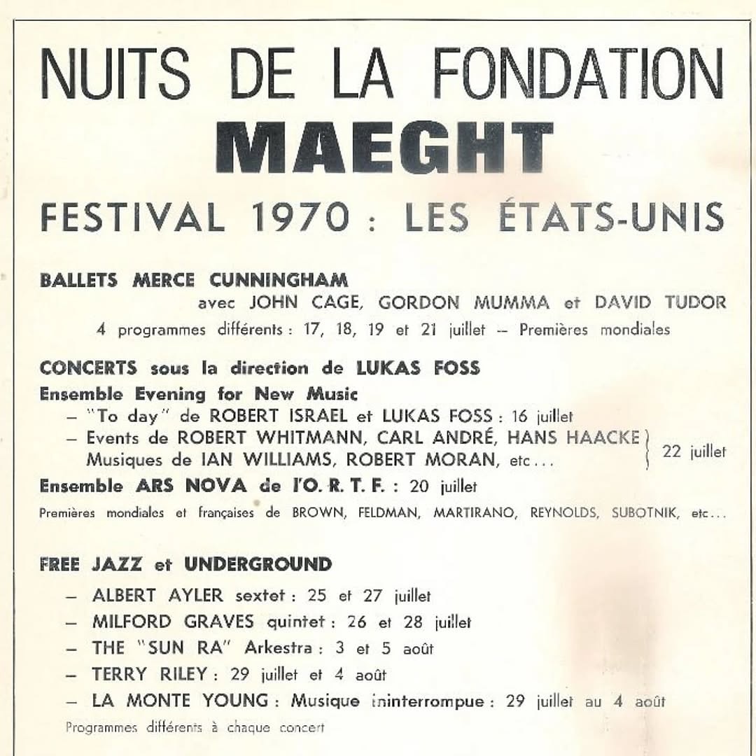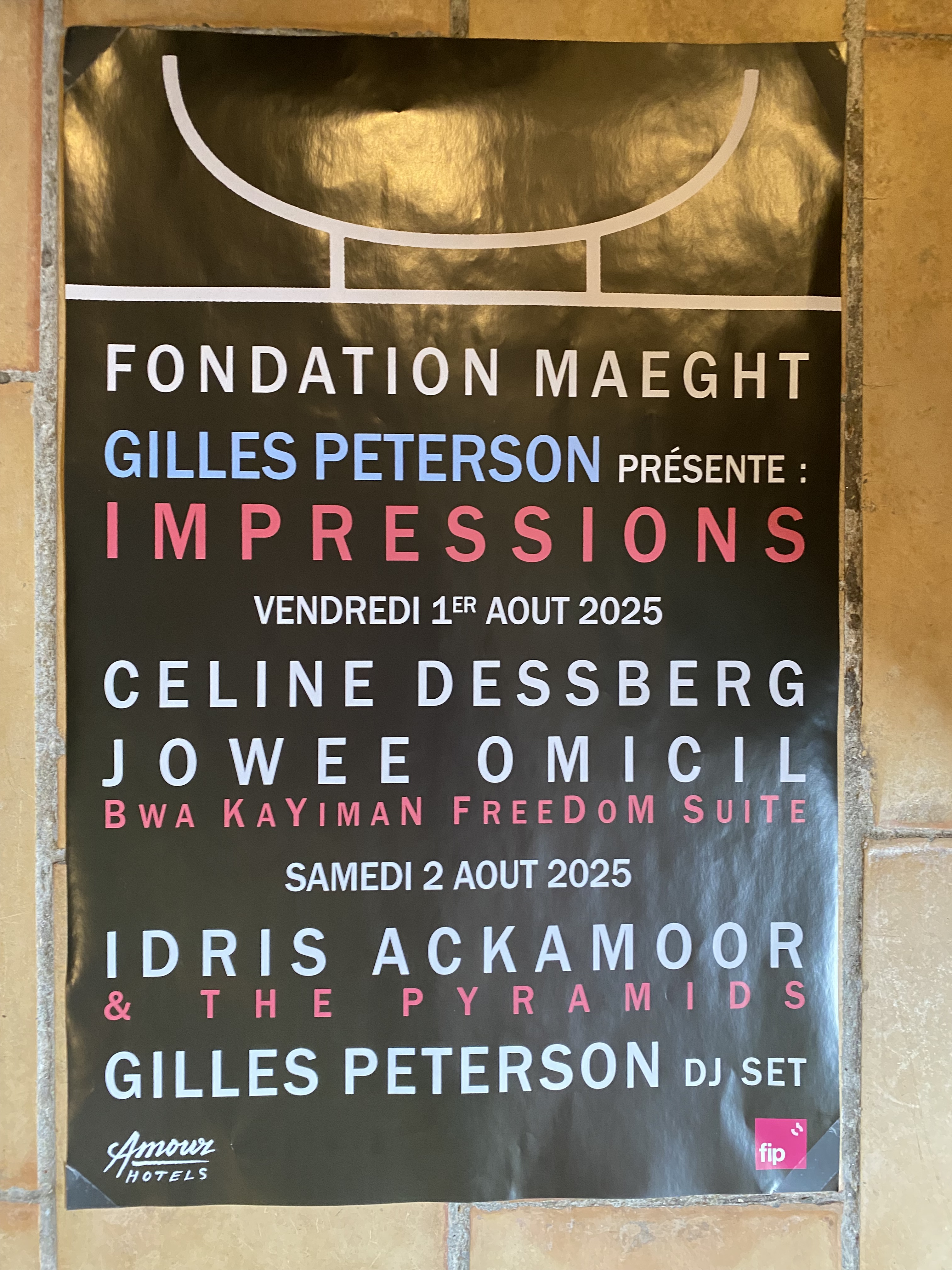 In July 1970 La Fondation Maeght in the South of France hosted a series of concerts, curated by Daniel Caux, a French musicologist, essayist, journalist, music critic, and radio producer. These extraordinary events showcased both electronic / minimalist music and avante garde free jazz alongside with the bold visual and conceptual art of the time. Fifty five years on – almost to the day – La Fondation Maeght , along with DJ/broadcaster/producer Gilles Peterson, has just hosted ‘Impressions’, their second 2 day event at the gallery, and it was a blast. It revived the groundbreaking musical spirit of the now legendary 1970 concerts – Sun Ra, Albert Ayler, Terry Riley, Cecil Taylor, Milford Graves, LaMonte Young, Terry Riley, Pierre Boulez, John Cage and Marian Zazeela – and introduced a new generation of listeners and art lovers to the works of Celine Dessberg, Joweee Omicil and Idris Ackamoor and The Pyramids.