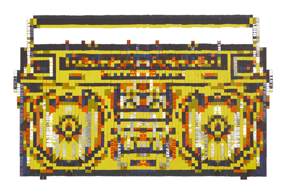 Along with recreating his favourite boom box in 2D and embossed with numerous references he delivers the connected images of a vinyl record and its sleeve. From a distance they are thoroughly convincing but up close they reveal a stack of musical memories from Tommy Steele’s ‘Little White Bull’ to the Pretty Things’ ‘Rosalyn’ to Otis Leavill. You need to spend a little time to take it all in but I was fully engaged in a journey that pretty much mirrored my own!