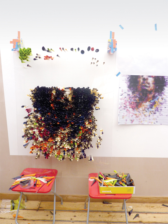 One wall is dominated by a piece constructed from cones of coloured paper that further the artist’s obsession with the phenomenon that was Jimi Hendrix. Somewhere in Ian’s memory banks resides an image of Hendrix – once seen but not forgotten – and it’s that which continues to inspire his effort to capture the man’s spirit.