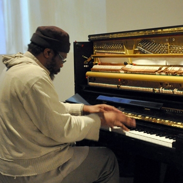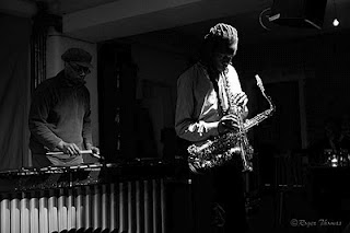 After forking out a tenner for a copy of McCullum’s ‘Distilled’ CD we settled in for a purely improvised set of “archaic Nubian” bizness from the trio Black Top. Improv is an art in itself and while it tends generate a combination of alienation and pure reverence, I like think we sometimes overlook it’s lighter moments and those fleeting snatches of humour. Interestingly and unusually, being in-the-round Orphy Robinson and Pat Thomas had their backs to each other and this left the saxophonist in a similar position as he wove his own melodic lines into music that built in haphazard intensity. That said, it was great to hear Steve Williamsonon both tenor and soprano back in the throes of a freestyle session where Orphy’s mallets danced around on his marimba, scatter gunning rhythms that allowed the bear-like Thomas to rove dangerously over the ivories or switch to electronics – loops, beats and blast of white noise.