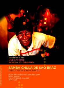 That said, Samba Chula is a tradition in danger of extinction and it’s being kept alive by two brothers, João do Boi and Alumínio, both Masters of the oral tradition of Samba Chula, and their friends and family. They perform as Samba Chula de São Braz and tonight they bring their deep and uplifting music and dance to Momo’s in central London