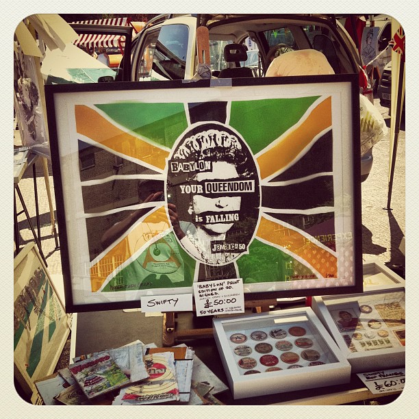 In December 2011, following the turbulent Dudus Coke affair, the Most Honourable Portia Simpson Miller aka Sister P was re-elected Prime Minister of Jamaica and declared their intention to sever the link to the “Mother Country” and become a Republic… check Swift’s big nod of respek to Jamie Reid and Peter Tosh RIP. It went on sale at the annual Art Car Boot Fair in Brick Lane yesterday.