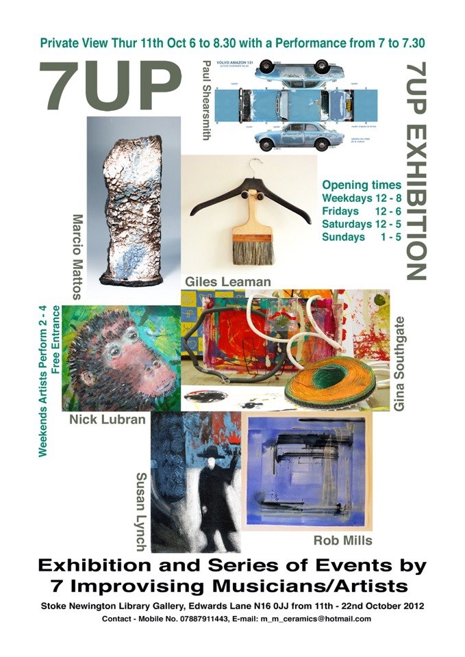 To celebrate this resurgence I wish to give props to a local exhibition – 7UP – which is currently happening in the Gallery at the back of Stoke Newington library in North London. This is their 2nd year and I passed through the show yesterday – rather late I’m afraid as it has already been running for a week – and encountered paintings inspired by improvised music (Gina Southgate) and visual art produced by artists who are primarily musicians.