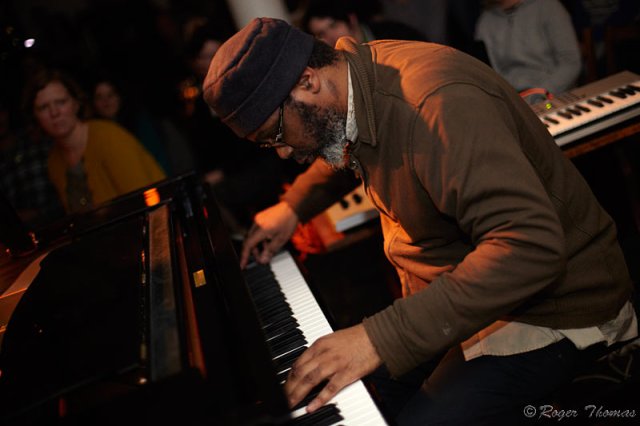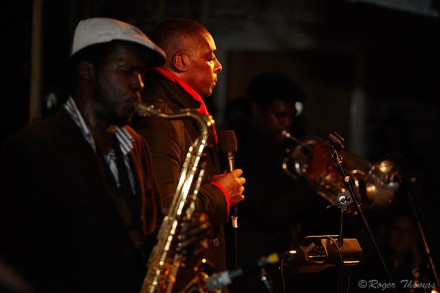 What’s compelling about Black Top? They groove. I find it hard to stand still when they’re playing. Cleveland is schooled in the art of beat boxing. He has lived through the junglist nights of rolling bass lines and waves of drum beats and on the mic he effortlessly carves out and crafts his own grooves. On this night, there are wordless African songs – maybe echoes of what he heard on a recent trip to Ghana. There are more poems and the odd Fact. There are loops and there are beats. The beats are taken up by Pat Thomas and at one point, Quietus Reporter Andy Thomas and I felt we were riding a house rhythm that would have had Moodymann or Theo Parrish jealously bouncing off the walls.