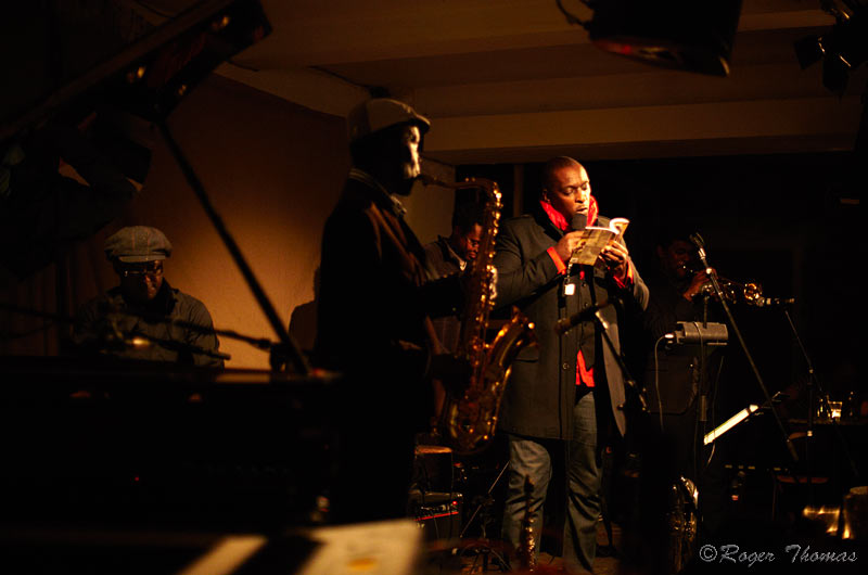 The interplay between these musicians is respectful. Filled with awareness of each others potential they nudge, play with, cajole a riff or a fleeting melody. It’s almost leisurely and and then without warning they lift it skywards, filling the room with sound until it builds and fractures only to find another elusive pulse to settle on. Cleveland delivers a Jamaican proverb. The singer is resplendent in a red silk scarf and shirt and he regularly dips into the poetic works of Shake Keane – a trumpeter, a forefather. The tradition continues and respect is paid. Shake Keane!