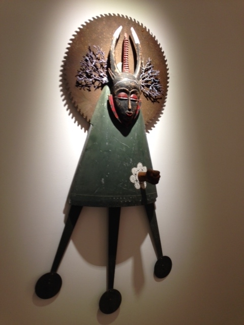 Found objects or objects collected on the journey… wooden crocodiles, driftwoood, some kind of wooden keys that resembled carved African masks, lace doilies, circular saw blades… are put to work in all the pieces. Figures are created using a chair back or legs from a table – legs which are then adorned with old school roller skates. His work is imbued with movement that spans time and place. As people we seem to be constantly on the move, migration is a fact of life in these times as it was in the past. Along with economic migrants there are still those who are forced to flee wars, famines, nuclear disaster. In one piece a globe sits at the end of a turned, spiraling piece of furniture while above it the masked face of this character is encircled by tiny lorries on the move..