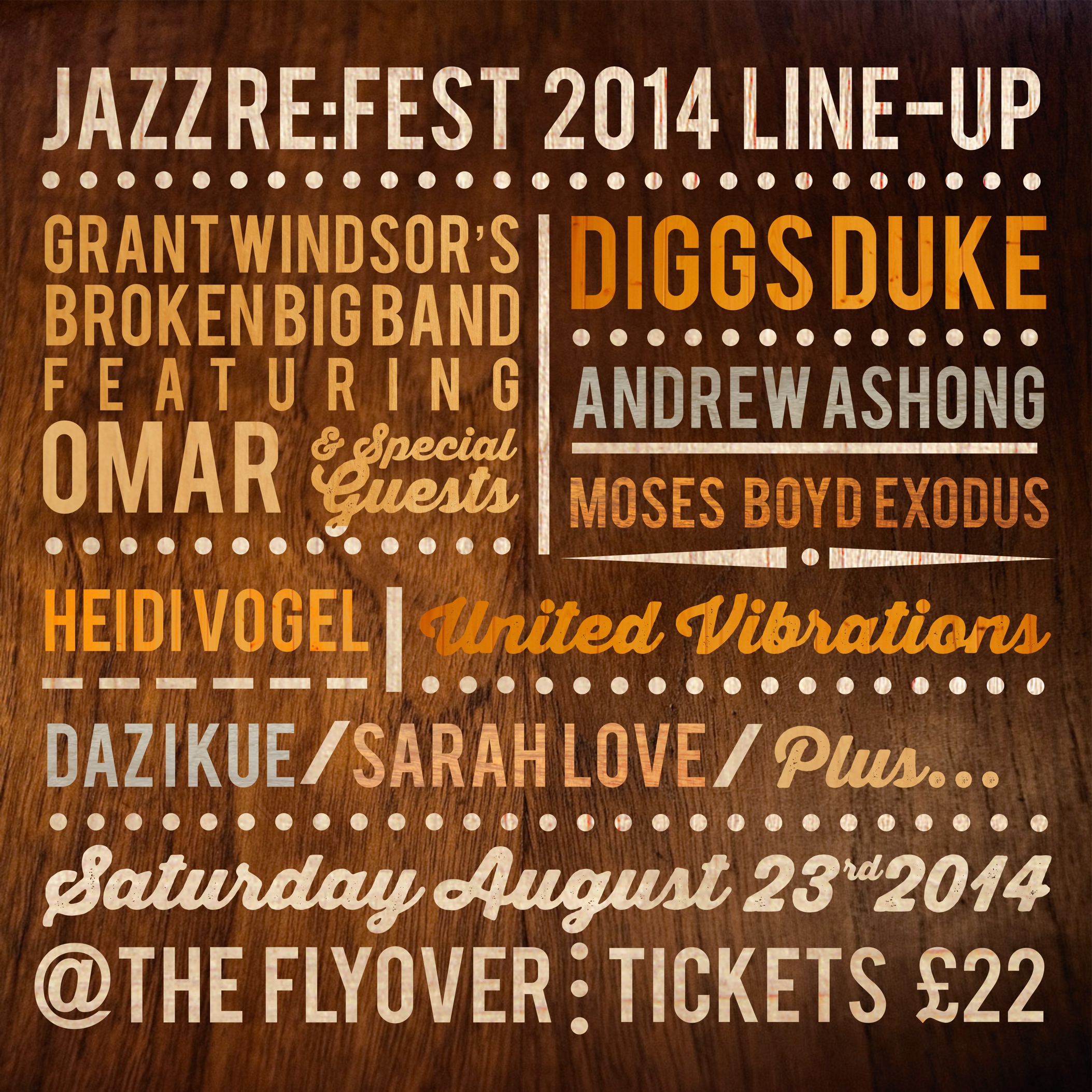 THE LINE- UP: Grant Windsor’s Broken Big Band ft. OMAR & Special guests, including Vula / Diggs Duke (Brownswood) / Andrew Ashong / United Vibrations / Heidi Vogel (Cinematic Orchestra) /Moses Boyd’s Exodus + Dj’s – Daz I Kue (Bugz in the Attic) / Sarah Love