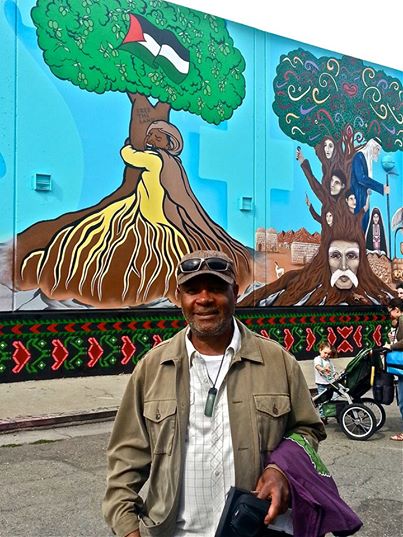 Great to see that Emory Douglas is still hard at work in his neighbourhood. Here’s a nice shot of the legendary revolutionary artist, who gave us the Black Panther Party’s most evocative artwork, standing next to his contribution to a new mural about the Palestinian freedom struggle that was recently unveiled in Oakland, California.