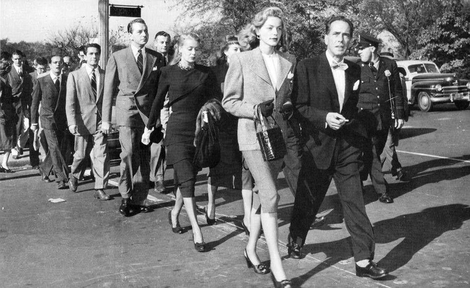 Lauren Bacall (1924-2014) and Humphrey Bogart lead a march to the Capitol in Washington, DC to protest against Senator McCarthy’s witch hunt of communists and alleged communists, 1947
