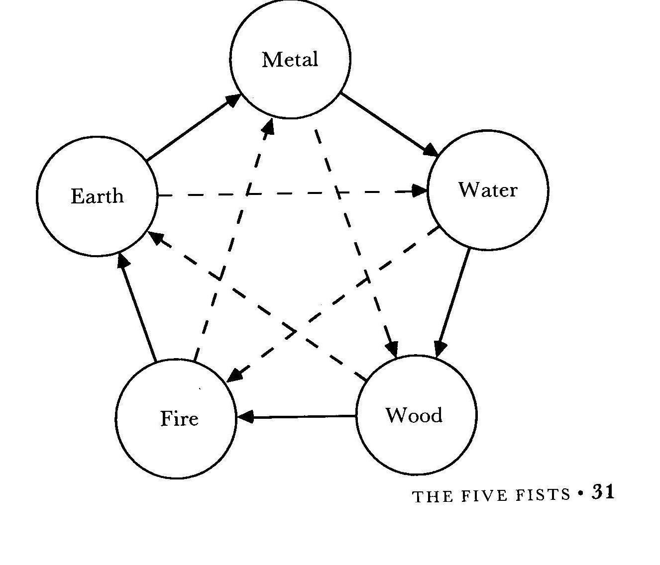When I took up Xing Yi Quan – which roughly translates as Form and Will boxing I opted to focus on the San Ti / 3-in-1 static standing posture (check the pic) and the five elements (WuXing) fists. I decided I had enough on my plate with these skills without adding the 12 animal postures and I was right. Basically, the five fists – Pi, Beng, Zuan, Pao, Zuan, Heng – are aligned to traditional Chinese cosmology – metal, wood, water, fire, earth. Each element is capable of generating or destroying another element as shown in the diagram below. The lines forming the pentagon indicate generation while the dotted lines forming the star indicate destruction.So, in the system I was learning Pi – metal – falls like an axe. However, upon reading Master Wu’s book I discovered that Pi in Dai family XinYi “is like an axe and classed as metal, but it is not an axe, its momentum is like scooping up and precious platter!” Similarly, beng “belongs to wood and looks like an arrow, but it is not an arrow! The momentum is of a sailboat rocking on the waves.” Awoahh… suddenly one is confronted with revising an ingrained mindset that’s built on a lot of practice and repetition. So, upon reading this book back it’s meant going back to the drawing board to focus on an alternative set of practices.