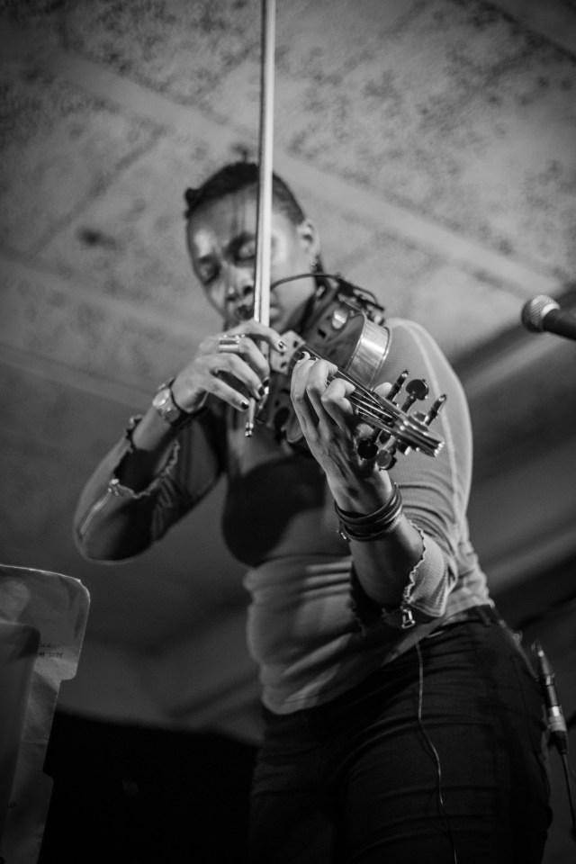 Stepping out in the night I was fired up and ready to return for another session the following night. I was not to be disappointed. First up came Hear In Now and that was a compositional and improvisational treat. These three bold women hunkered down onstage in close proximity to each other. They clearly “enjoy each others company” – as violinist Mazz Swift confirmed – and their music along with their explorative individual solos produced an unspoken, intuitive sense of communication and conversation. Who in the house could not love a ‘Prayer For Wadud’ – dedicated to the legendary cellist – or the reflective piece on their sad departure from Livorno in Tuscany – the home of bassist Silvia Bolignesi? All credit goes to the TRC audience who wasted little time in producing a hushed silence throughout the room. There was a lot of listening going down – both nights! I definitely needed to hear more from this trio and immediately snapped up a copy of their CD.