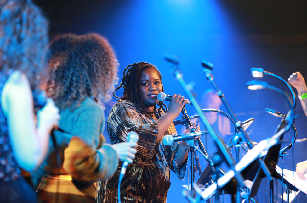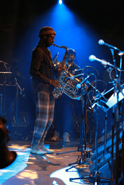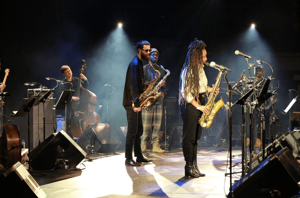 It was down to the Junior Band to kick the show off with ‘Oyinbo’. It was genuinely touching to witness Gary Crosby – not long recovered from a stroke – on the bass. It was a master and apprentice vibe as the understudy looked on and took in the rhythm Gary that was laying down before being handed the instrument to continue the piece. The impact on the audience of 13 year old Nahuel Angius-Thomas on bassoon was immediate. His sound was deep! As their set progressed flautist Keira Chakrobarty, trumpet player Fin Hori-Ohrstrom and pianist Kyle Osbourne were joined by the mighty duo of Shabaka and Theon Cross. At the back of the stage excellent young drummer Nico Sargese was joined by Tom Skinner on another kit. The energy and intensity reached another level that was felt throughout the room. ‘Inner Babylon’ was deep ‘n’ funky.